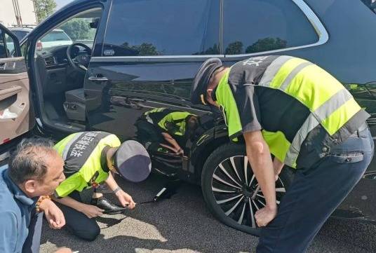 事情要追溯到10月1日11时许,来自徐州市的陈女士一家驾驶SUV前往烟台探亲,行至沈海高速公路734公里烟台方向时,车辆左后轮胎突然损坏,无法继续行驶。由于陈女士一家刚取得机动车驾驶证不久,面对车辆故障束手无策,正陷入焦急时,正在该路段执行高速公路保通疏导任务的执法支队工作人员陆鹏及时发现了这一情况。