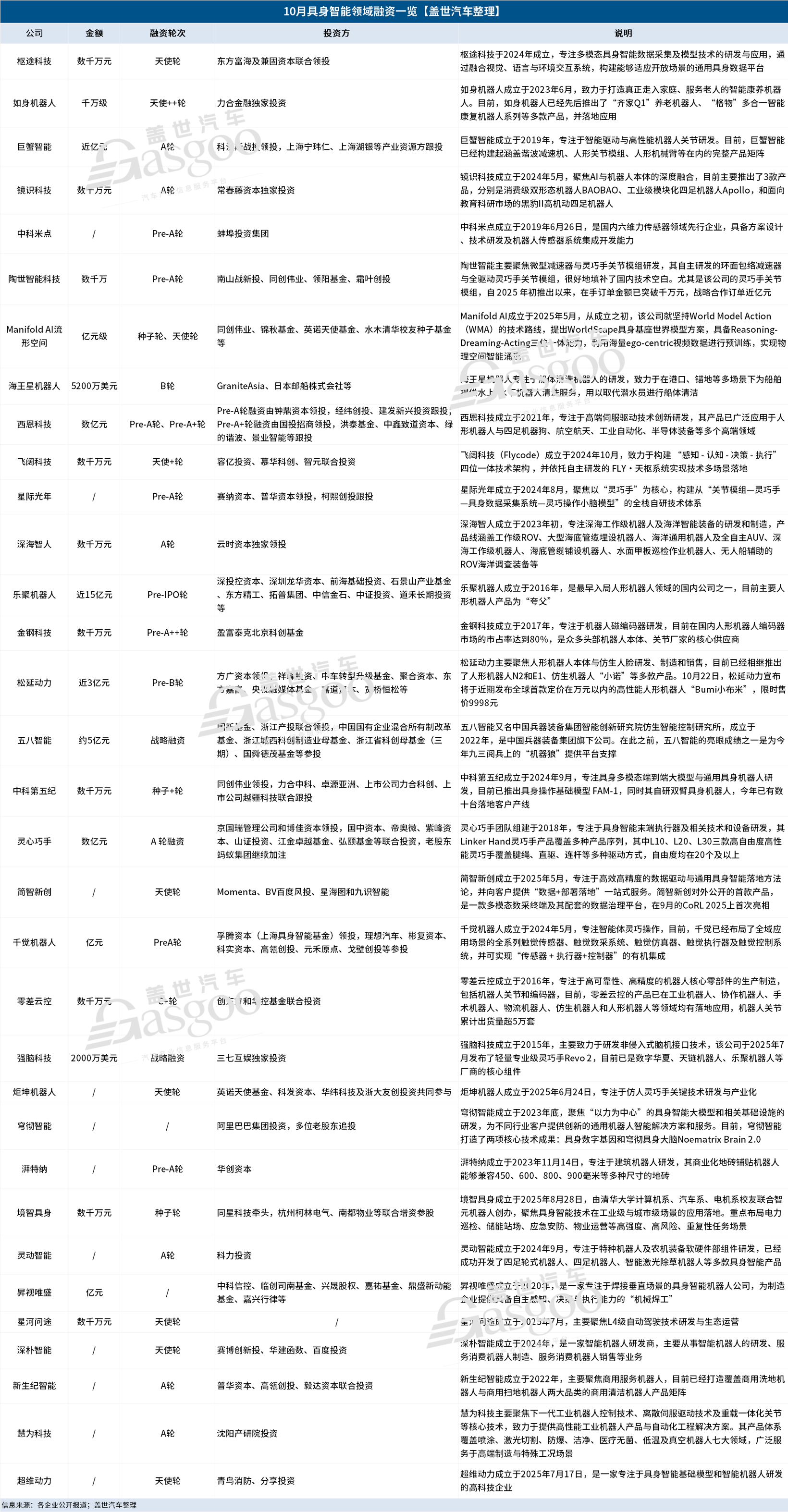 从10月具身智能赛道的融资态势来看,行业呈现“头部企业虹吸效应显著、细分赛道多点开花”的鲜明特征。据盖世汽车统计,10月在具身智能机器人及相关核心技术领域,已知披露的融资事件多达33起,市场热度持续高涨。其中,乐聚机器人凭借近15亿元的Pre-IPO轮融资,成为当月“吸金王”。