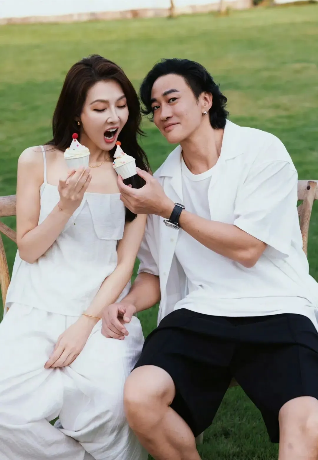 画面里,他穿着白T黑裤,笑意干净;妻子林姵希一袭白衣,长发轻垂,笑弯了眼。