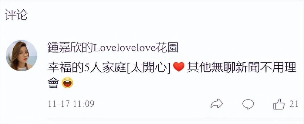 但很快就辟谣,声称两夫妻很恩爱,在11月17日,钟嘉欣还在自己的社交平台上晒出全家福,同时还发文:现在准备好温暖过圣诞了,我们的五人组“梁”家人。还在评论区让大家不要理会她婚变的消息,都是假的。
